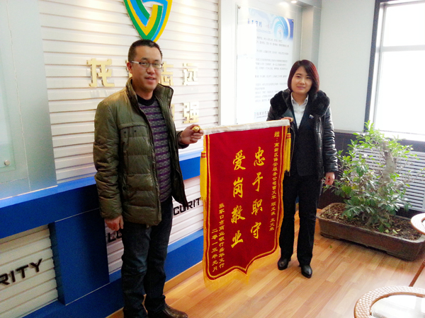 2015年1月份,一位八十多歲高齡的老人到張家口市商業(yè)銀行某支行辦理取錢業(yè)務(wù)時,因老人年事已高患有老年病,與銀行的工作人員發(fā)生了沖突,無論工作人員如何解釋,仍無法溝通,至此,老人經(jīng)常到該行找工作人員滋事,老人的行為嚴重影響到支行的正常業(yè)務(wù),為客戶辦理業(yè)務(wù)帶來了不便,為維護好銀行正常秩序,我公司派駐支行的保安隊員顧龍液、王文來,主動接近老人進行勸阻,交流溝通,問寒問暖,緩解老人心態(tài)。之后我公司曹文平隊長得知此事,也趕到支行協(xié)助處理,幫忙找到了老人的家人,在家人的勸說下,老人離開了支行,支行恢復(fù)了正常的工作秩序。經(jīng)過此事,我公司保安大隊長曹文平及派駐到張家口市商業(yè)銀行的保安隊員顧龍液、王文來受到了張家口市商業(yè)銀行支行領(lǐng)導(dǎo)的高度贊揚,特到我公司送來了錦旗與表揚信,對我公司進行感謝。